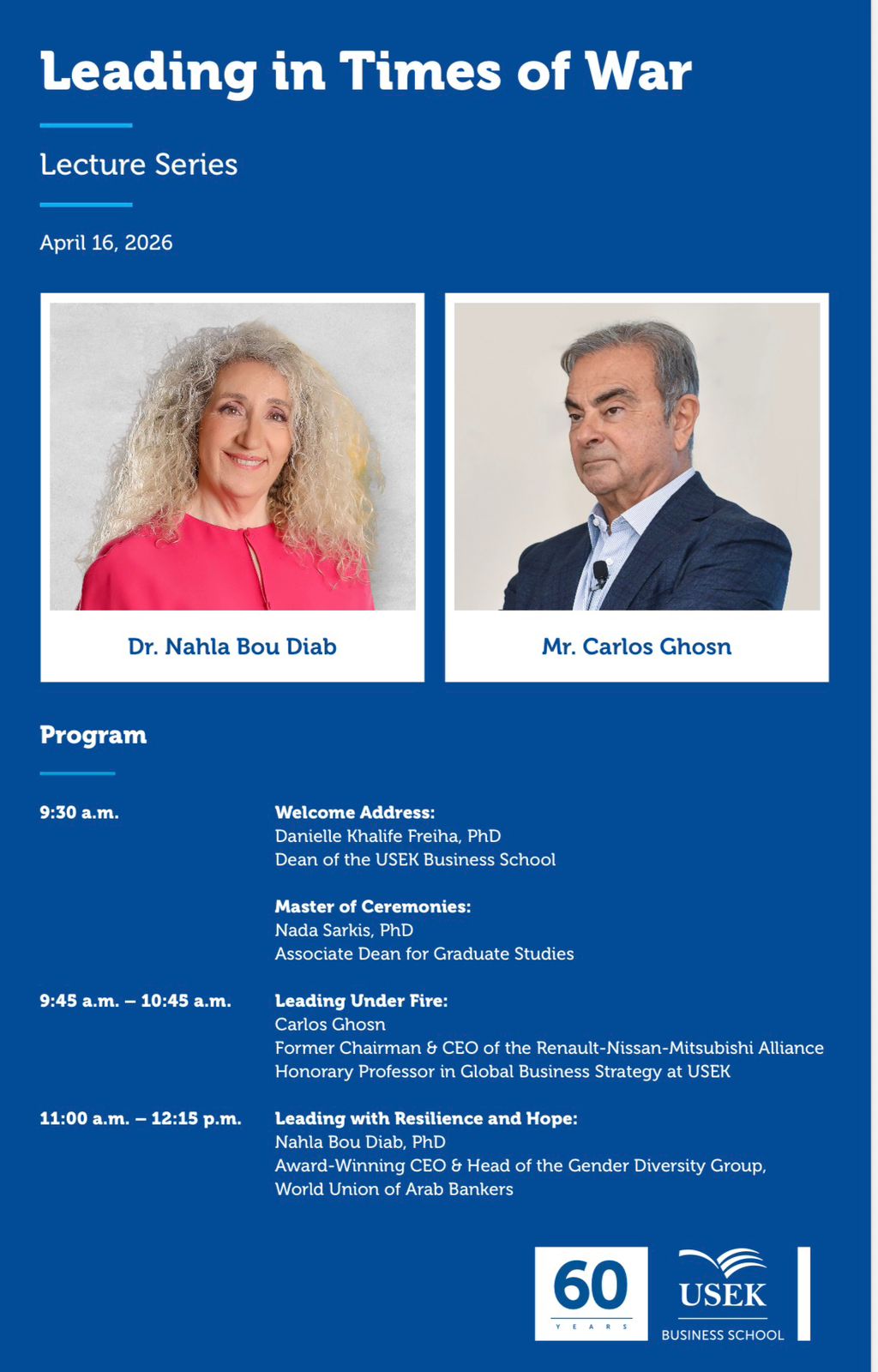 تنظم كلية إدارة الأعمال في جامعة الروح القدس – الكسليك اليوم الخميس 16 نيسان 2026، من الساعة 9:30 صباحًا حتى 12:15 ظهرًا، سلسلة محاضرات بعنوان: “القيادة في زمن الحرب”، يشارك فيها رائد الأعمال العالمي كارلوس غصن ورئيسة مجموعة التنوع الجندري في الاتحاد الدولي للمصرفيين العرب الدكتورة نهلا بو دياب، حيث سيدور نقاش معمّق حول الأخلاقيات والاستراتيجيات والمرونة في سياقات عالية الضغط، في قاعة البابا يوحنا بولس الثاني، في حرم الجامعة في الكسليك.